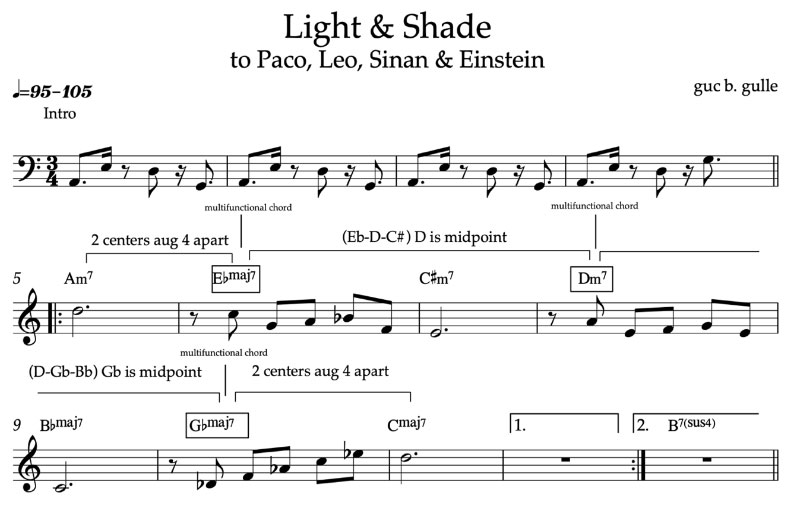 Down below, you can see the symmetrical forms created by equal divisions. The most well-known example for this type of approach is the harmonic progression in John Coltrane’s Giant Steps. In the second example, you can see how three tonic centres are created in the first eight measures of this piece via major 3rd divisions. Even though the centres are accentuated by dominant resolutions, the lack of any kind of tonal relationship between them implies that the piece is non-functional.