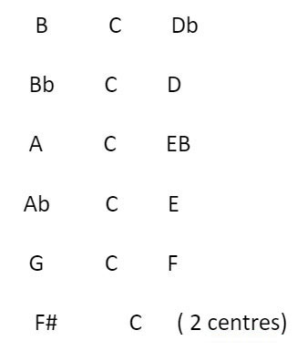 Up to this point we have examined chord relations of the diatonic chords and the related secondary dominants. Now we will start to discuss non-diatonic chords that do not appear as secondary dominants. These deeper level analyses will deal with the areas that relate to the centre by the structural relationships of 4ths and 5ths, as can be seen below. The structural progression of 4ths and 5ths, a necessary condition of tonal harmony, makes all of these relationships possible.