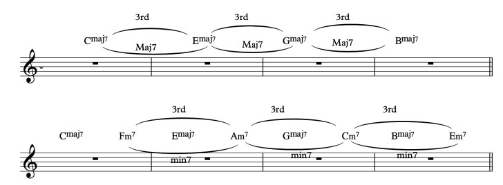 In this kind of structure, the harmonic progression is created by modeling the relationship between two chords. Unlike constant structures, there are no constant parameters in model-based progressions. The model has no other function besides being copied. In the example below, you can see that the minor 3rd relationship between Cmaj7 and Ebmaj7 is determined and then copied. There are no guidelines on where the other models begin. Therefore there is no other connection besides the minor 3rd relationship between these chord pairings.